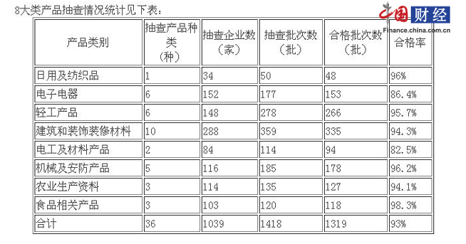 中國網(wǎng)財經(jīng)8月1日訊 陜西省質(zhì)量技術(shù)監(jiān)督局官網(wǎng)昨日發(fā)布消息,該局2017年上半年組織開展了日用及紡織品、電子電器、輕工產(chǎn)品、建筑和裝飾裝修材料、機(jī)械及安防、電工及材料、農(nóng)業(yè)生產(chǎn)資料、食品相關(guān)產(chǎn)品等8大類36種產(chǎn)品質(zhì)量監(jiān)督抽查。共抽查了1039家生產(chǎn)和經(jīng)銷企業(yè)的1418批次樣品,經(jīng)檢驗,合格企業(yè)946家,合格樣品1319批次,產(chǎn)品總體抽查合格率為93%。